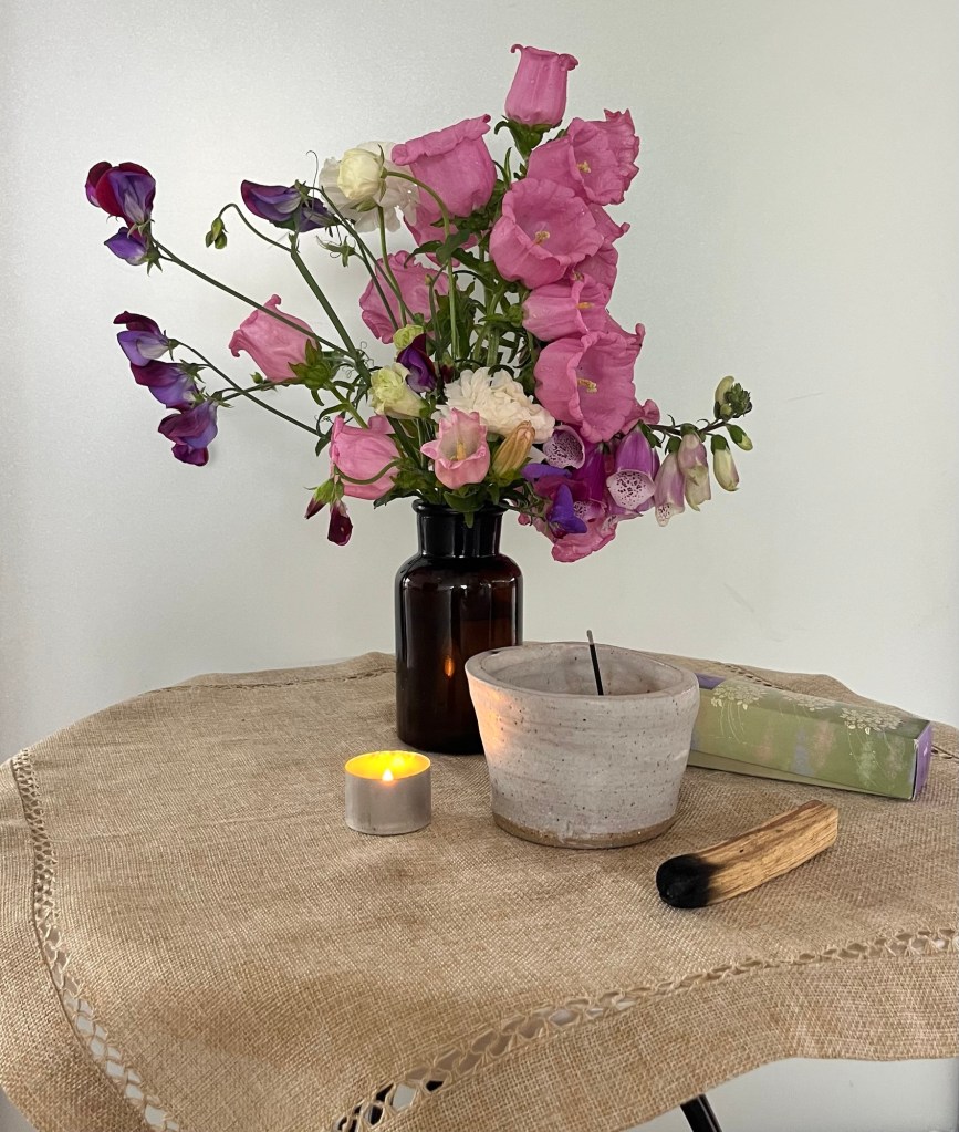 🌸 Setting up for class ~ honouring the space, lighting incense, candles, arranging flowers I’ve cut from my garden and making tea.