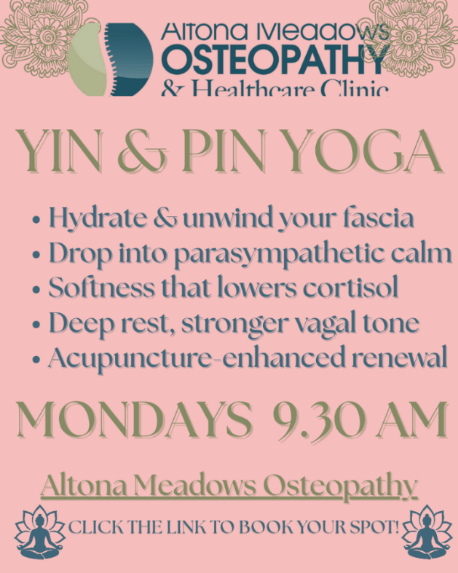 I’ll be joining the wonderful Care Team at Altona Meadows Osteopathy & Healthcare Clinic, providing group Yin Yoga Classes. Would love you to join me for a 75 min Yin & Pin (acupuncture) experience alongside Dr Jodie Ellen McEwan – a Traditional Chinese Medicine Doctor and Acupuncturist.